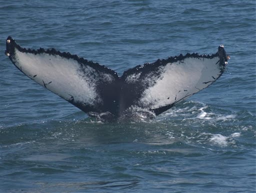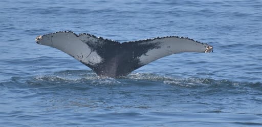 When you see Captain Jeff, naturalist interns or myself aboard walking around with our cameras, we are trying to get the money shot of the whale, which is their fluke or their tail. The picture that we would really like to get is of the underside of their fluke. This is because each fluke has a unique pattern, which we use to identify the whales, kind of like fingerprints for humans. We are looking to see how long an individual stays in our area and if an individual comes back year after year, as well as how far north or south they travel. The colorings of the pectoral fins and flukes also differ within the whales between the Pacific and the Atlantic oceans. Both oceans can have whales that have the prominent white under color, but the Pacific can also have whales that have no or very little white coloring on both the fluke and pectoral fins. We also take pictures of the dorsal fin and of any scarring the whale may have to further identify whales in our area.