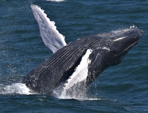 When we go out on our 3-hour long whale watching excursion, we are taking you guys out to find a humpback whale! While out we may encounter a finback whale, but they are not as commonly seen inshore than the humpback is. It is very common for the humpback and the finback to be mistaken for each other. One difference between the two whales are their colorings, humpbacks have a black and white coloring throughout their body, whereas finbacks are mostly one color of grey. Humpback whales also have the longest pectoral fins (flippers) of any whale, being 1/3 their body length. This means that, if we see a humpback whale that is 40 feet long, their flipper is about 13 feet long!