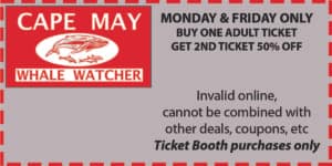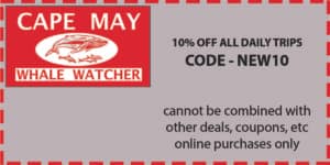 Good for any Daily marine mammal trips aboard Cape May Whale Watcher Departs from the Miss Chris Marina, 1218 Wilson Drive, Cape May, New Jersey 800-786-5445 or 609-884-5445.